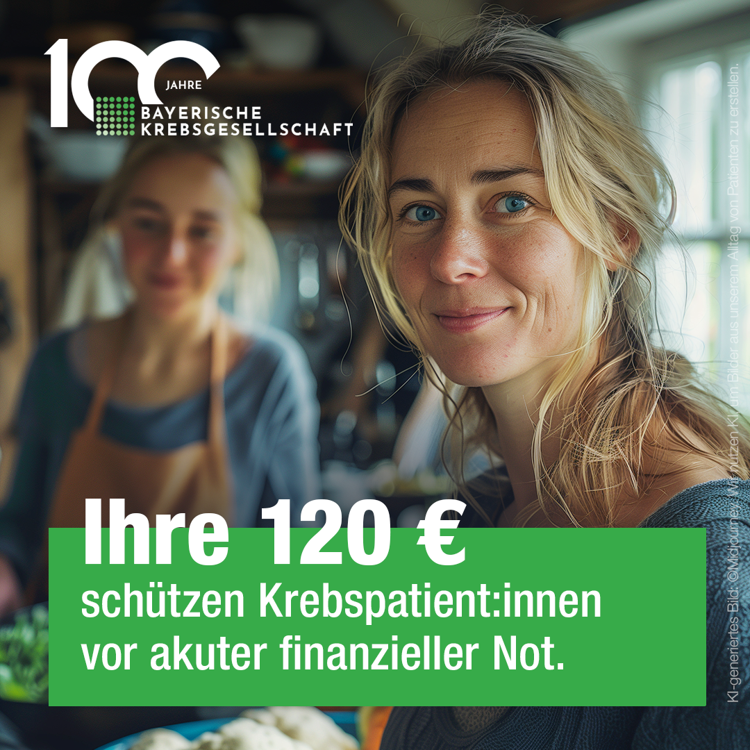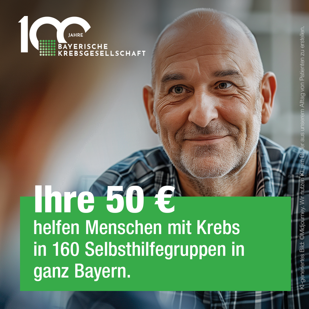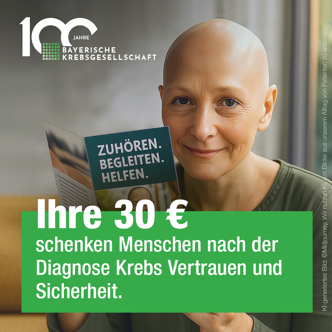 Mit Ihrer Spende helfen Sie Menschen in Bayern, einer Krebserkrankung mutig zu begegnen und ein offenes Miteinander zu fördern. Ihre Spende ermöglicht empathische Begleitung, zuverlässige Hilfe und stärkt Prävention und Aufklärung, damit mehr Menschen gesund bleiben.