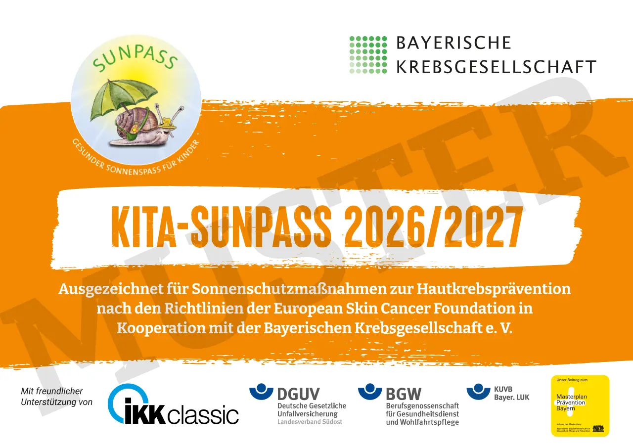 Die Bayerische Krebsgesellschaft zeichnet Kindertageseinrichtungen in Bayern als „Sonnenschutz-Kitas“ aus, die sich aktiv für den Hautschutz der Kinder einsetzen, geeignete Sonnenschutzmaßnahmen in ihrer Einrichtung umsetzen und alle Punkte der „Sonnenschutzvereinbarung“ erfüllen.