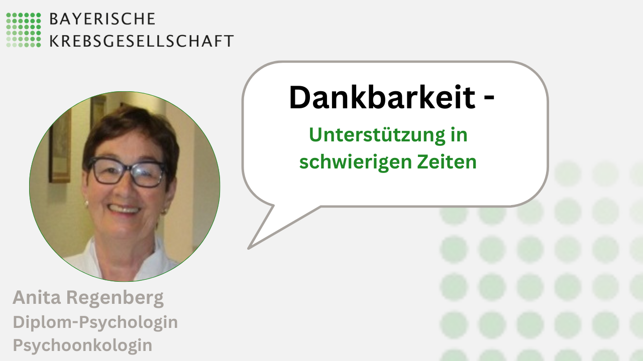 Dankbarkeit ist eine wichtige Kraft, eine innere Haltung, die zur psychischen Gesundheit beitragen kann. Psychologin Anita Regenberg, unsere Psychoonkologin in der Psychosozialen Krebsberatung am Patientenhaus München, weiß aufgrund ihrer langjährigen Praxiserfahrung, wie wichtig es ist, im Krankheitsfall die eigenen Ressourcen zu stärken. Denn eine Krebsdiagnose erschüttert das bisherige Leben in all seinen Grundfesten.