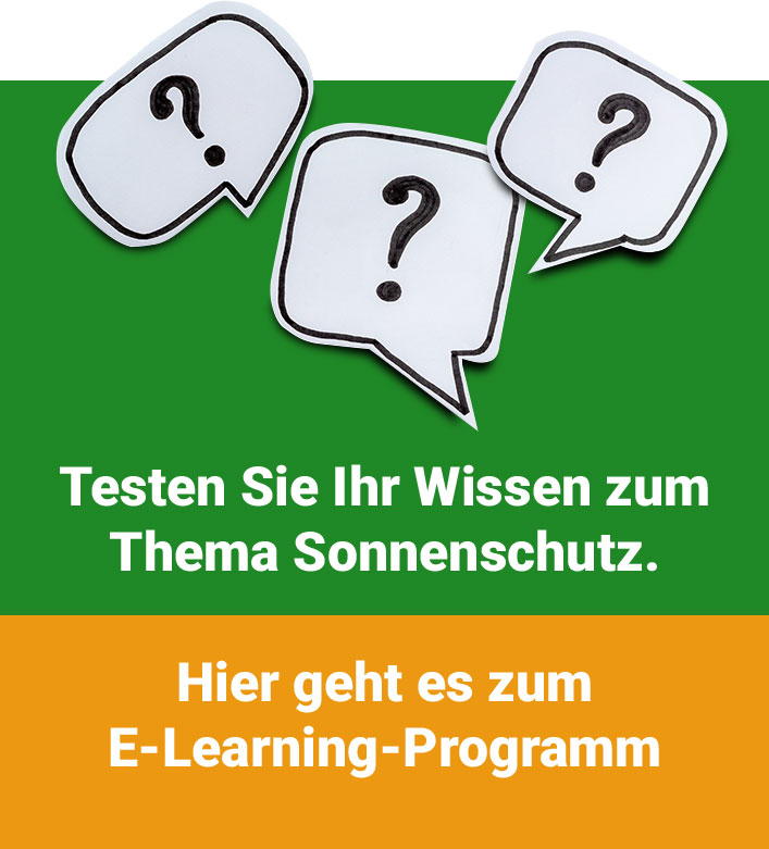- E-Learning-Programm mit wichtigen Informationen rund um das Thema Sonnenschutz. Mithilfe der Verständnisfragen am Ende können Sie den eigenen Wissenstand überprüfen.